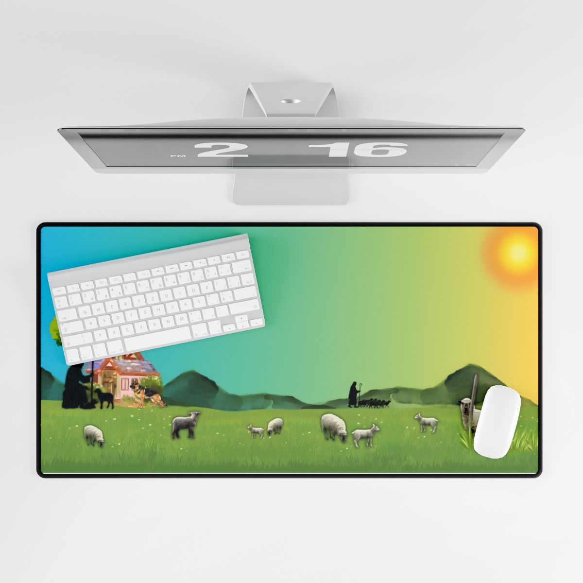 This stunning desk mat features a serene pastoral scene filled with gentle sheep, rolling green hills, a warm sunrise, and the silhouette of a shepherd caring for his flock near a cozy cottage. The artwork blends watercolor textures with soft gradients, creating a calming and uplifting environment for your daily tasks.